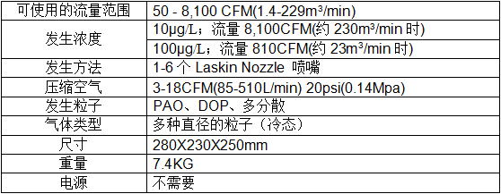 便携式Laskin喷头喷雾型悬浮粒子发生器能产生次微米的多种直径的油雾悬浮粒子,浓度从 10 到100 微克/升,当流速在 50 到 8,100 立方英尺每分钟之间(压力在 20 psi下)。